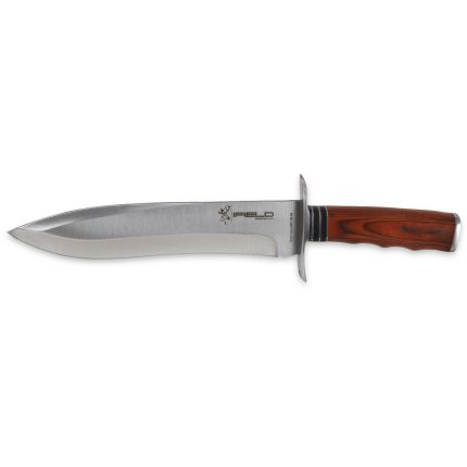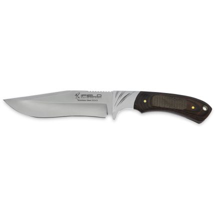 Cuchillo de caza deportivo de la marca iFIELD Camper, largo total 26 cms, hoja de 14 cm de acero inox 3Cr13, mango stamina decorada CNC, incluye funda de piel de alta calidad color marrón