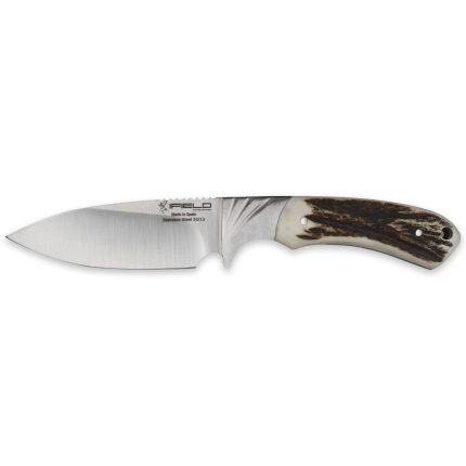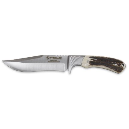 Cuchillo de caza deportivo de la marca iFIELD Camper, mango de asta de ciervo con separadores de piel, longitud total 37 cms, hoja de 23,5 cms, incluye funda de piel marrón, referencia EL29012