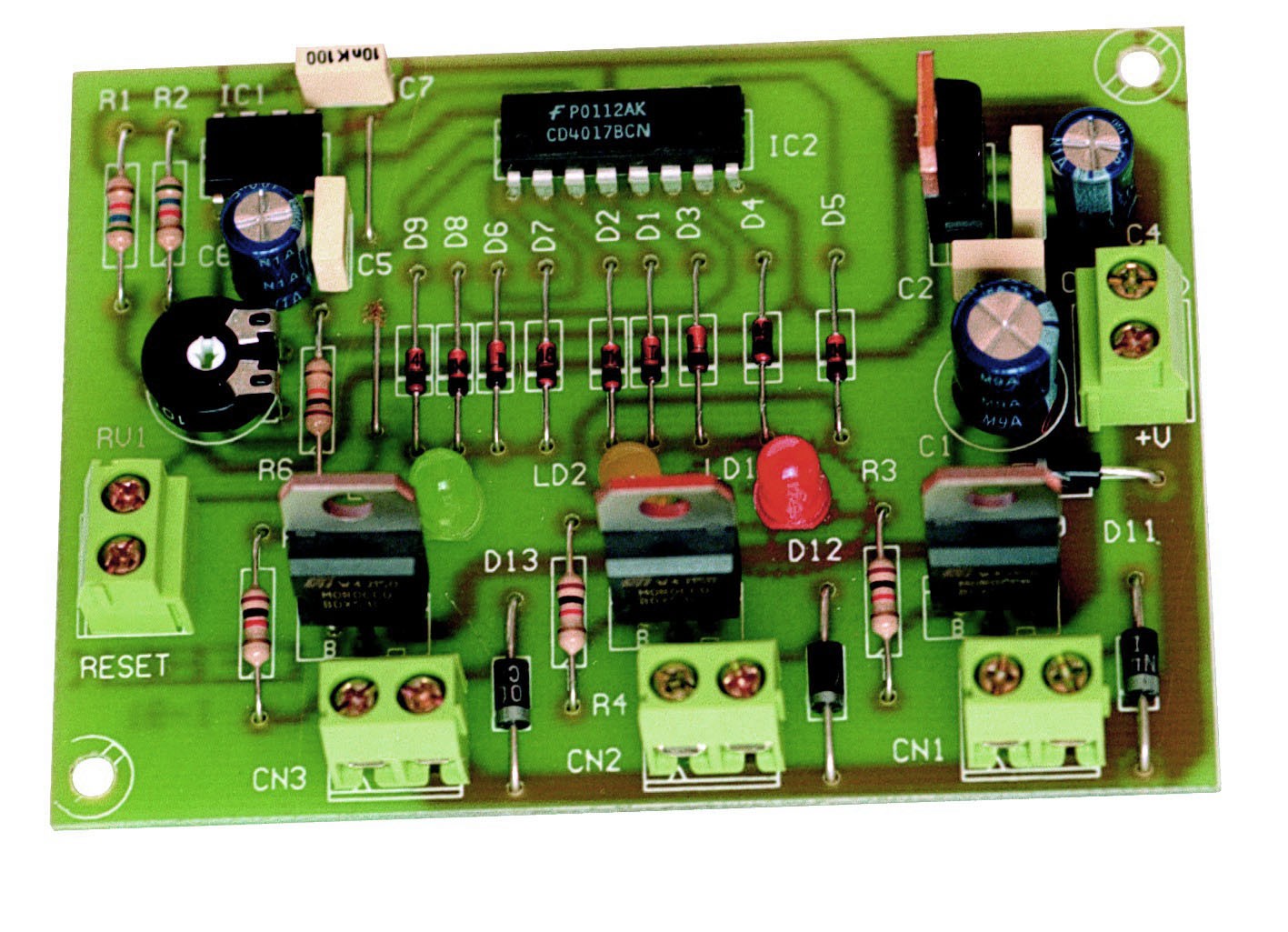 Automatismo de semáforo electrónico. Realiza la secuencia natural de un semáforo, conectando secuencialmente las salidas correspondientes a verde, ámbar y rojo. Las salidas se realizan mediante transistores NPN, con una carga máxima admisible de 2-DI A. Permite ajustar la temporización entre 5 y 50 seg. para las salidas verde y roja, mientras que la del ámbar siempre temporizará una cuarta parte del tiempo establecido para las otras. Incorpora leds indicadores, protección contra la inversión de polaridad y bornes de conexión. Fuente FE-134