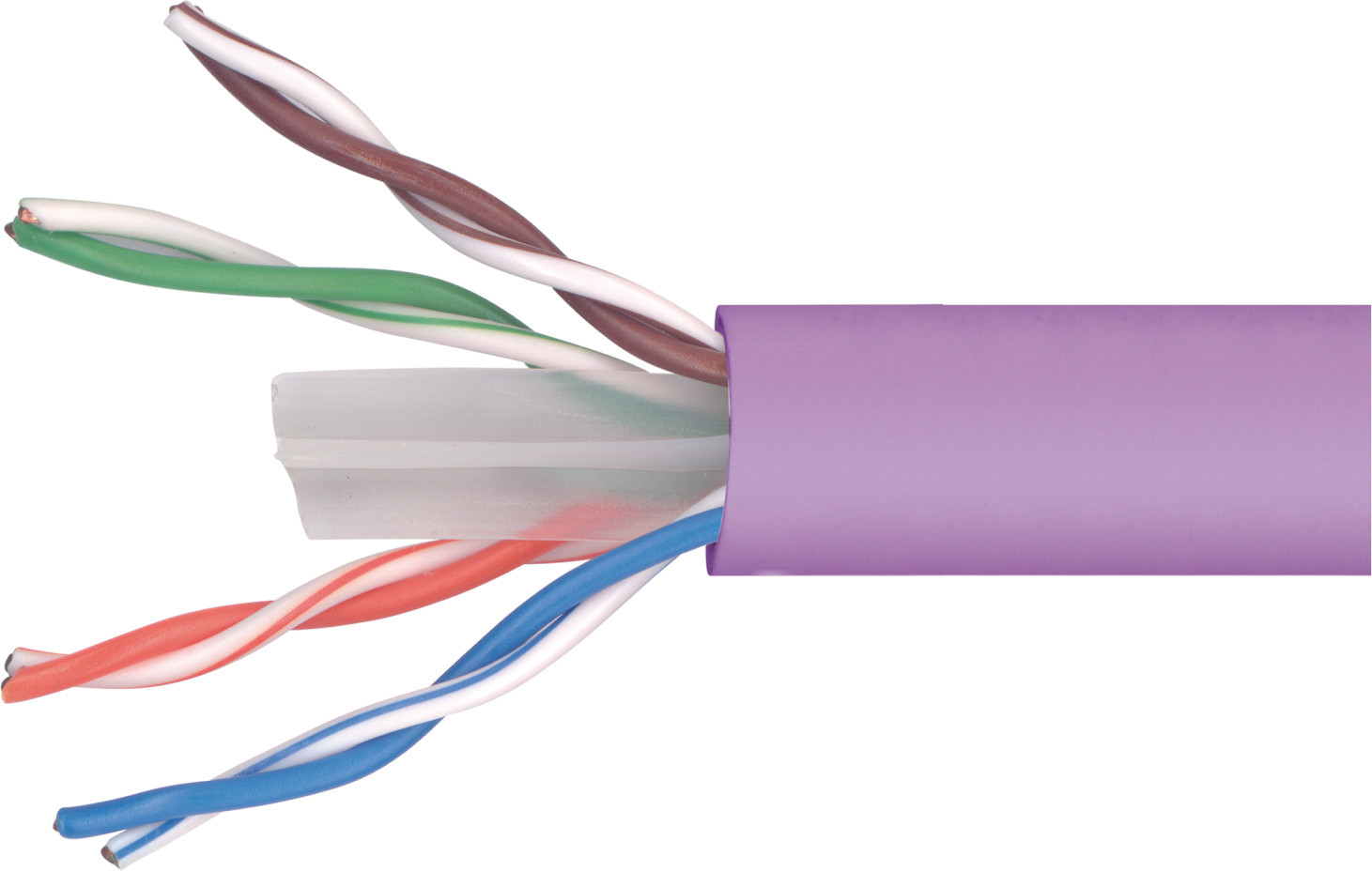 Cable de datos de categoría 6 y Euroclase Fca, de tipo U/UTP (sin blindaje), con conductor de CCA y cubierta de LSFH (Low Smoke Free of Halogen) en color violeta (RAL 4008).