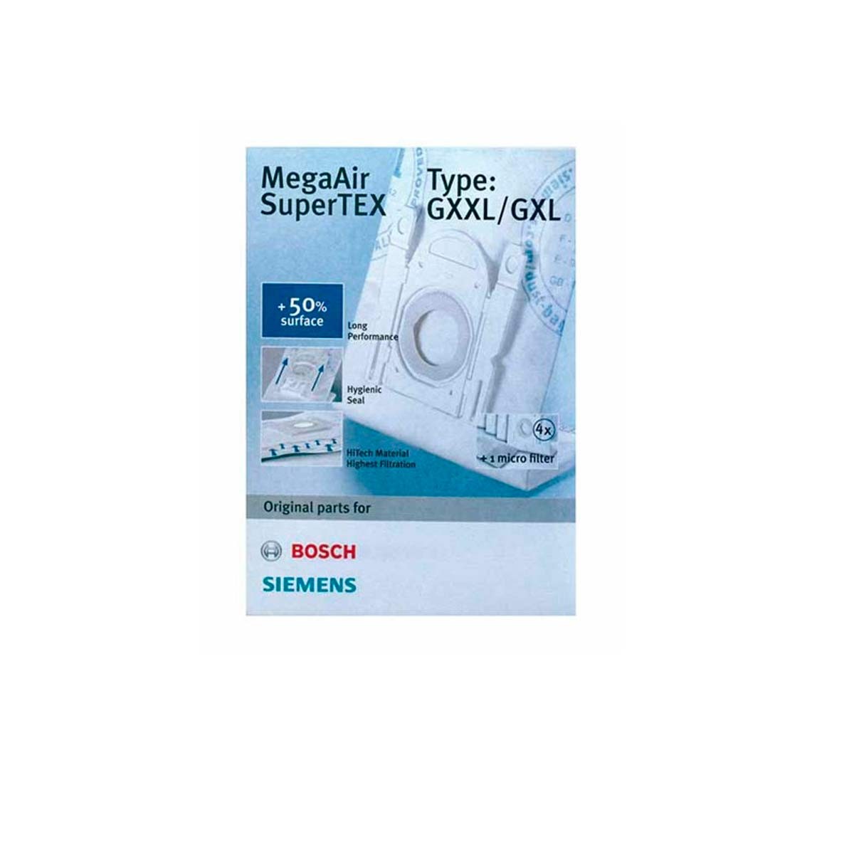 Bolsa aspiradora Bosch. Tipo: GXXL/GXL. Código Fabricante: 463510, 576863, 463511, VZ41AFGXXL, 467342, 469748.