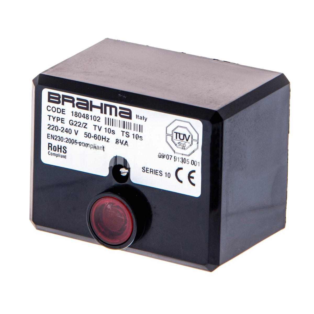 Centralita quemador gasóleo. 1 llama. BRAHMA 18048102 G22/Z TV10S TS10S. 220/ 240V 50/ 60 Hz Dimensiones: 85,4 x 65,4 x 69 mm Tiempos -Prepurga (Tv) 1,5/10/20/30s. Seguridad(Ts) 5/10s. ECOFLAM, FRANCO BELGE, FBR, THERMITAL.