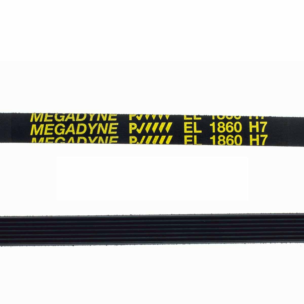 Correa de transmisión de 1860 mm de desarrollo, encargada de transmitir el movimiento del motor al tambor de la secadora. Longitud: 1860 mm Ranura: tipo H Dientes: 7 Canales: 6 Elasticidad: EL Fabricante: Megadyne. Va montada en secadoras de las marcas Ariston, Fagor, Aspes, Edesa, White Westinghouse, Indesit, Creda, Kneissel, Aquarus, Hotpoint, Brandt, entre otras muchas marcas