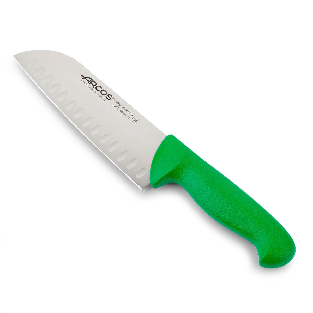 Cuchillo Santoku Arcos 2900- Prof  290621 con alveolos de acero inoxidable Nitrum y mango ergonómico de Polipropileno hoja de 18 cm, funda display