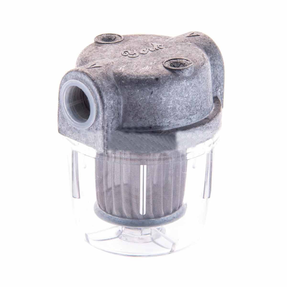 Filtro en aluminio y vaso en resina transparente. Rosca: 3/8″. Caudal: 40 kg/h. Malla: 0,1 um. Uso para quemador gasóleo y fuel caldera.