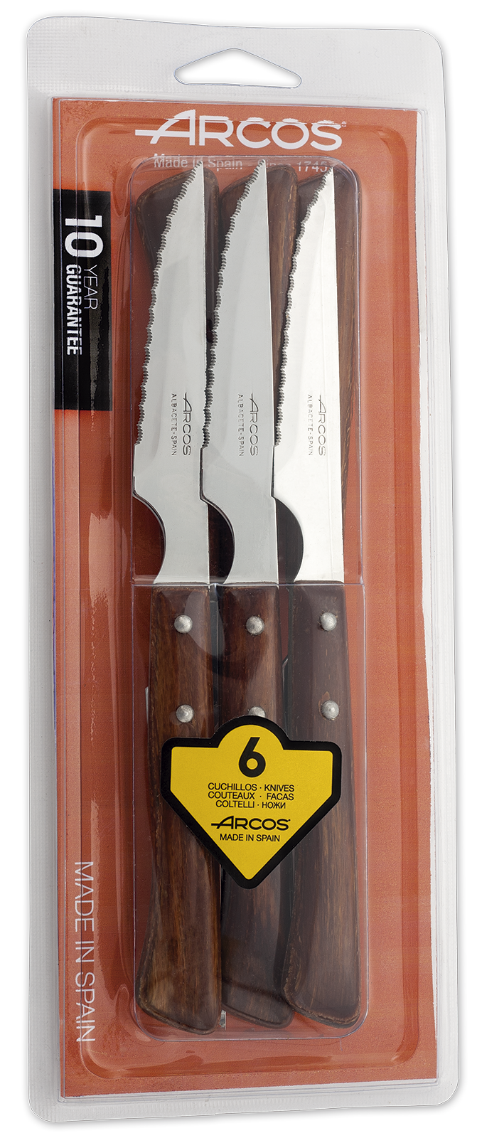 Juego de Cuchillos Chuleteros  Arcos de Mesa 372000 monoblock de una pieza de acero inoxidable, mango de madera comprimida ,hoja de 11 cm en blíster