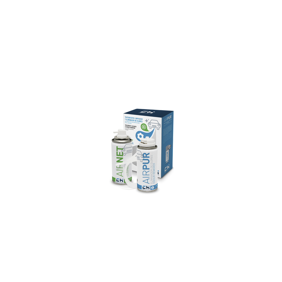 KIT AIRNET AIRPUR auto (Kit 2 aerosoles) limpia y elimina los malos olores del aire acondicionado de su vehículo en solo dos pasos. Elimina por contacto las acumulaciones de suciedad producidas por el paso del aire, microorganismos, nicotina, polvo, etc.  y mantiene el circuito y el habitáculo libre de olores desagradables.