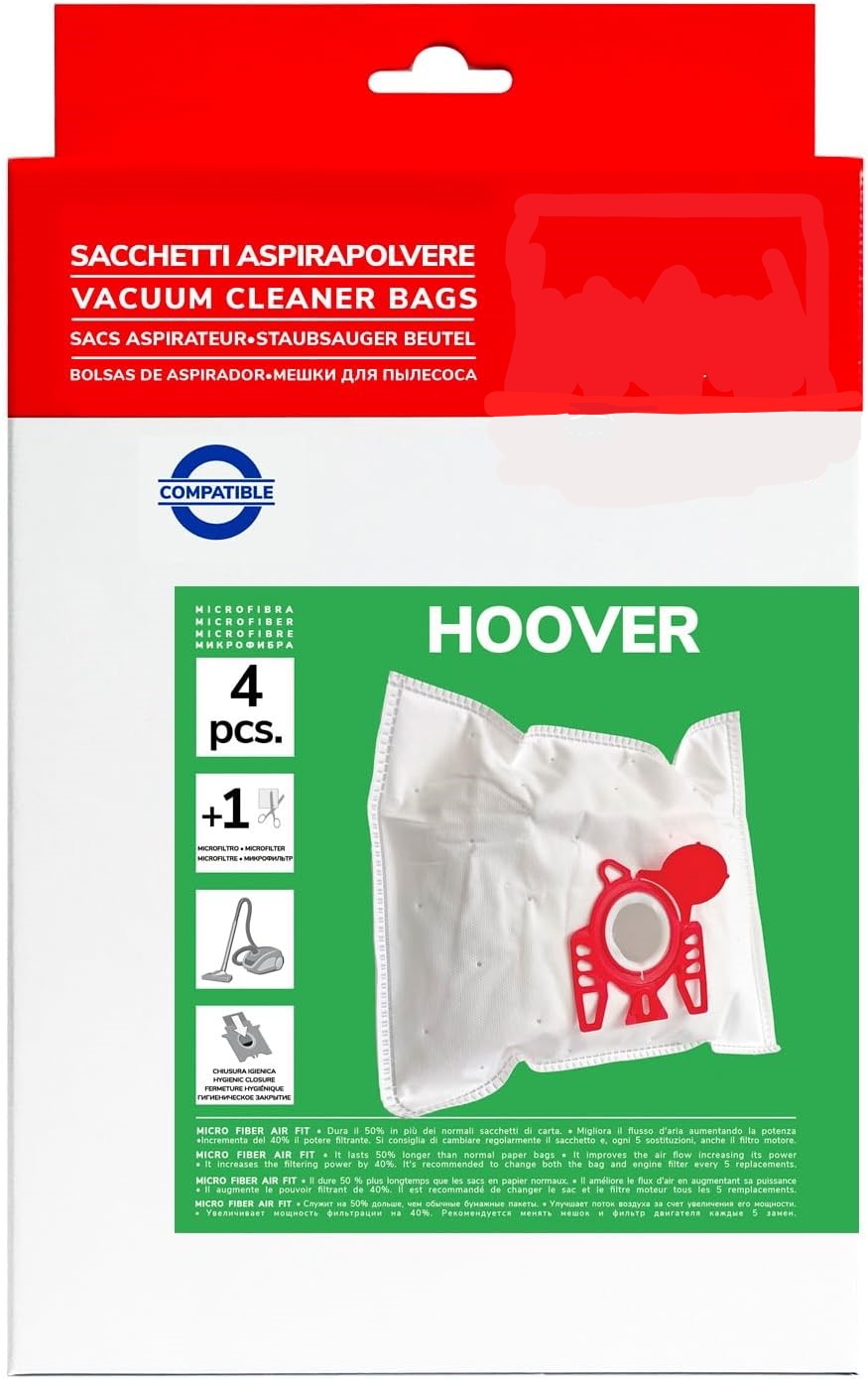 Juego de 4 bolsas de microfibra de alta calidad compatibles con aspiradoras Hoover. Diseñadas para ofrecer una mayor capacidad de filtrado y una duración superior frente a las bolsas de papel tradicionales. Cada bolsa cuenta con un cierre higiénico que evita la dispersión del polvo durante el cambio. Incluye un filtro recortable que protege el motor de la aspiradora frente a polvo y suciedad, prolongando su vida útil y manteniendo su potencia de succión.