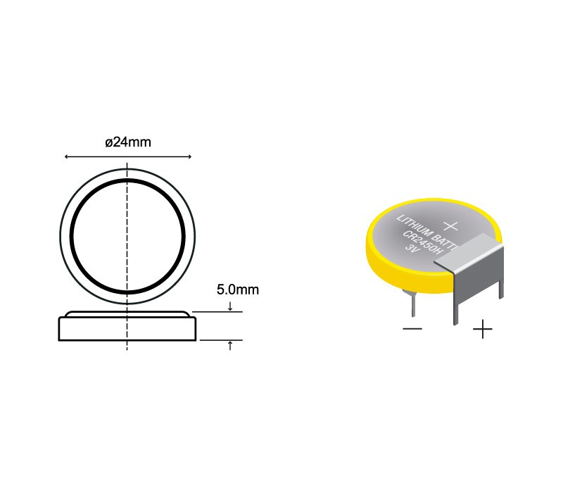 Pila Litio CR2450H 3Vdc 630mA Horizontal 3pin Soldar con referencia de producto 19800-DI y EAN 8436300700104