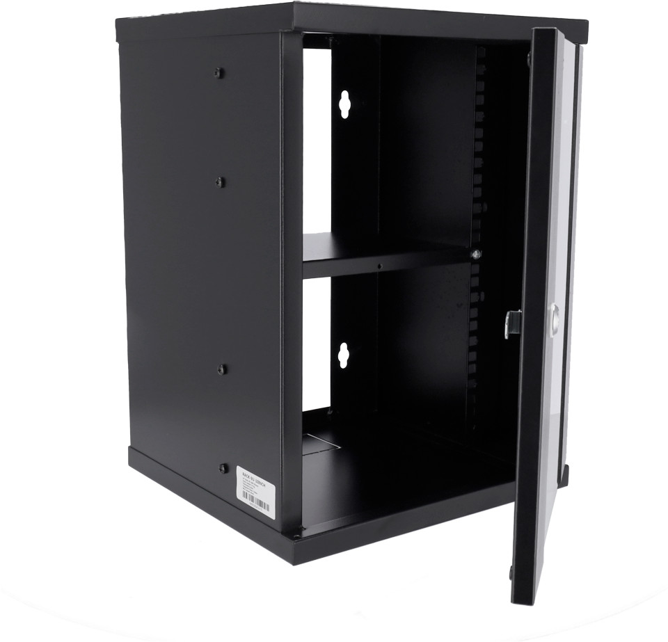Armario Rack de 10″ 9U Instalación en pared Capacidad de carga 15 Kg Puerta frontal de vidrio templado de 5 mm con más de 180 grados de giro Entradas para cableado en la parte superior e inferior Cuatro orificios de instalación en el panel posterior Fabricada en acero SPCC Profundidad de 300 mm Grado de protección IP20Color negro