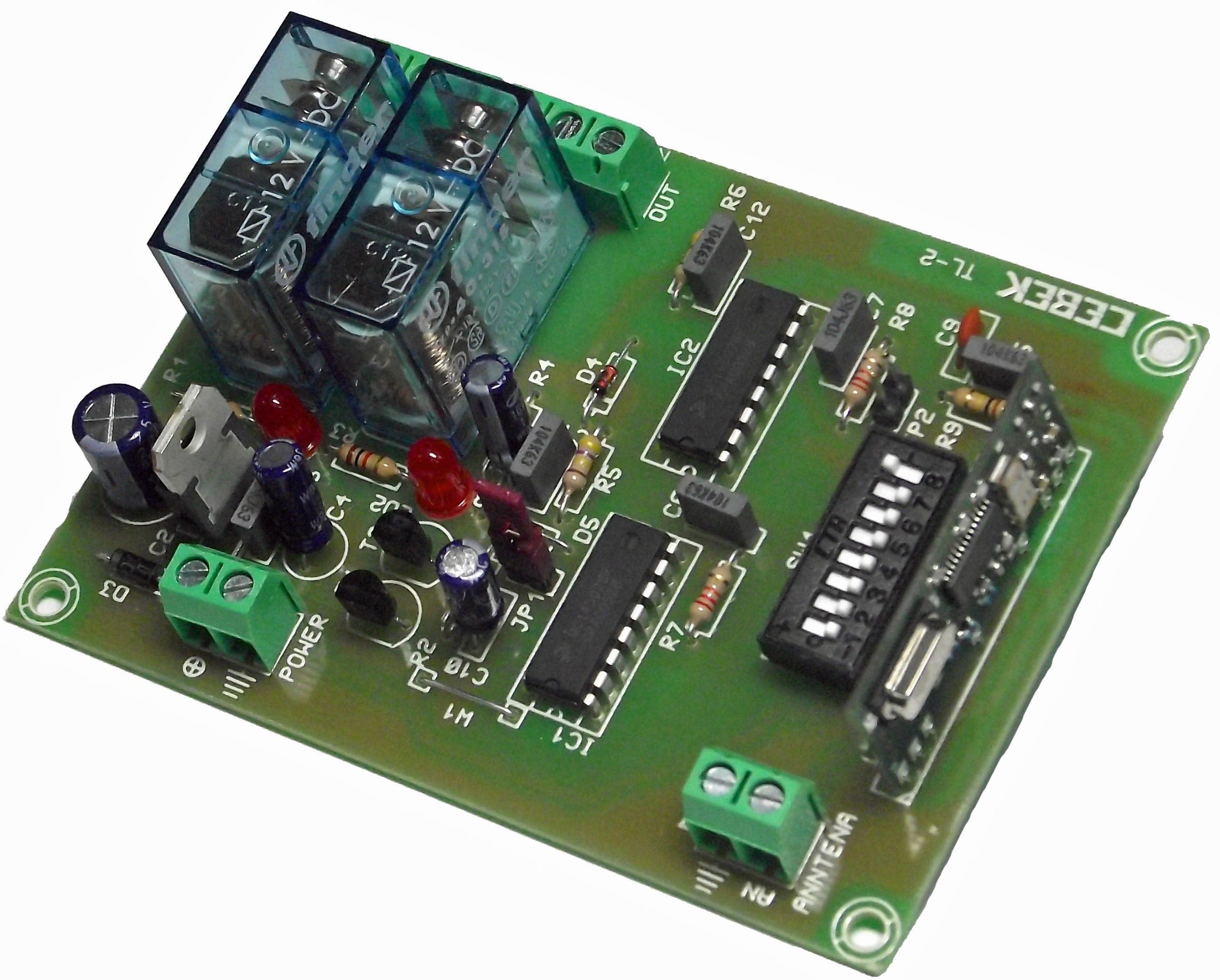 Telemando receptore por R.F., de 2 salidas a relé. Decodificará e interpretará la señal enviada por los emisores por R.F. Cebek de 1 o 2 canales. Mientras se presionen los pulsadores en el emisor, la correspondientes salidas del receptor se mantendrán conectada, desconectándose al dejar de pulsar el emisor. Funciona en la frecuencia homologada, 43-DI3-DI.92 Mhz. Incorpora bornes de conexión, led indicador de trabajo y P.I.P. Fuente recomendada para este módulo: FE-103-DI