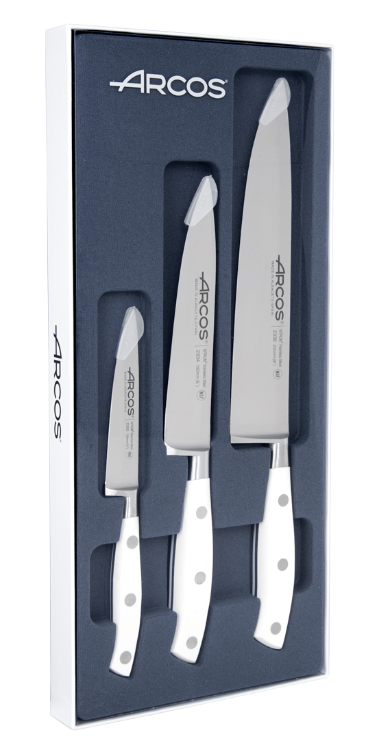 Incluye tres tipos de cuchillos diferentes: un cuchillo mondador con una hoja de 100 mm, un cuchillo cocinero con una hoja de 150 mm, y un cuchillo cocinero de 200 mm de hoja.