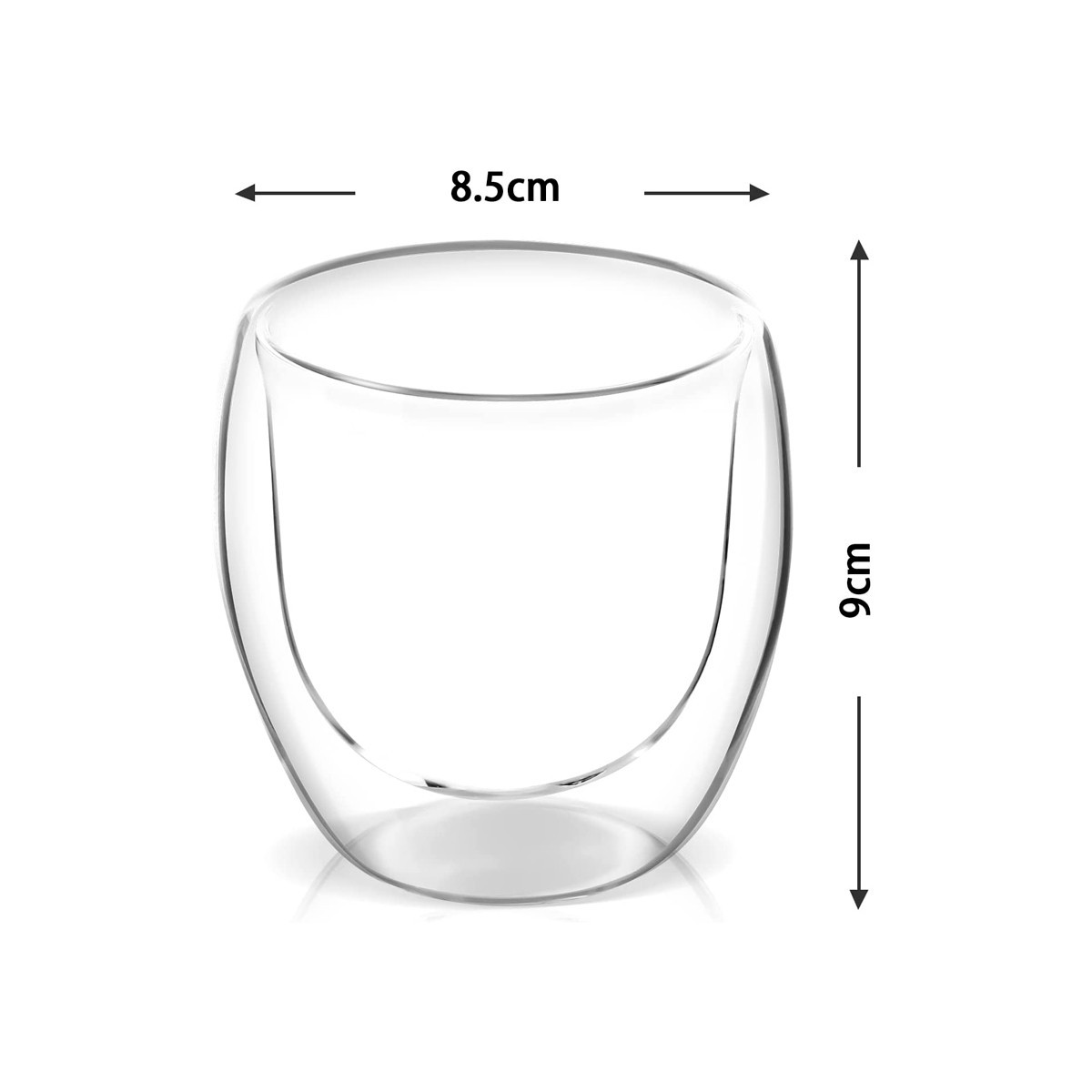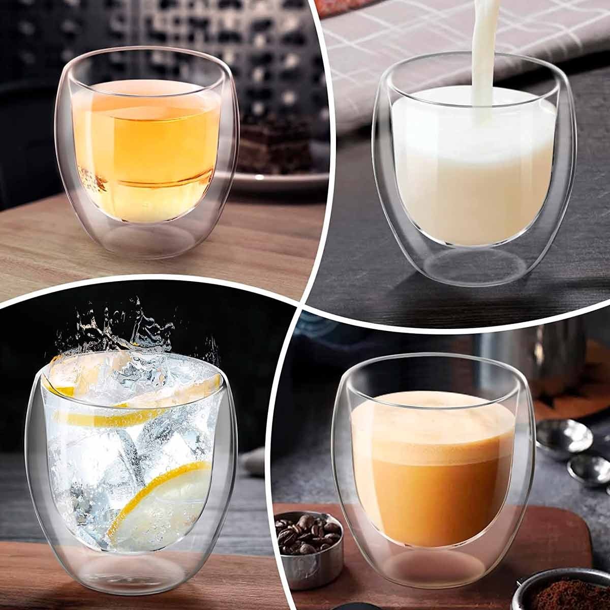 Set de 4 vasos de doble cristal Taza de 250 ML de doble pared resistente al calor. Para café te helado bebidas calientes frías o postres. La taza de café de vidrio de doble pared está hecha de vidrio de borosilicato alto resistente al calor y anti condensación, que es más duradero y perfecto que el vidrio tradicional, con una superficie lisa y una apariencia transparente. La taza de café de vidrio de doble pared está hecha de vidrio de borosilicato de alta calidad sin plomo, que es más seguro, seguro y saludable para los alimentos. El vidrio de doble capa fabricado con alto contenido de borosilicato puede proteger sus dedos de los efectos de las altas temperaturas y el frío, lo cual es muy adecuado para bebidas frías y calientes.