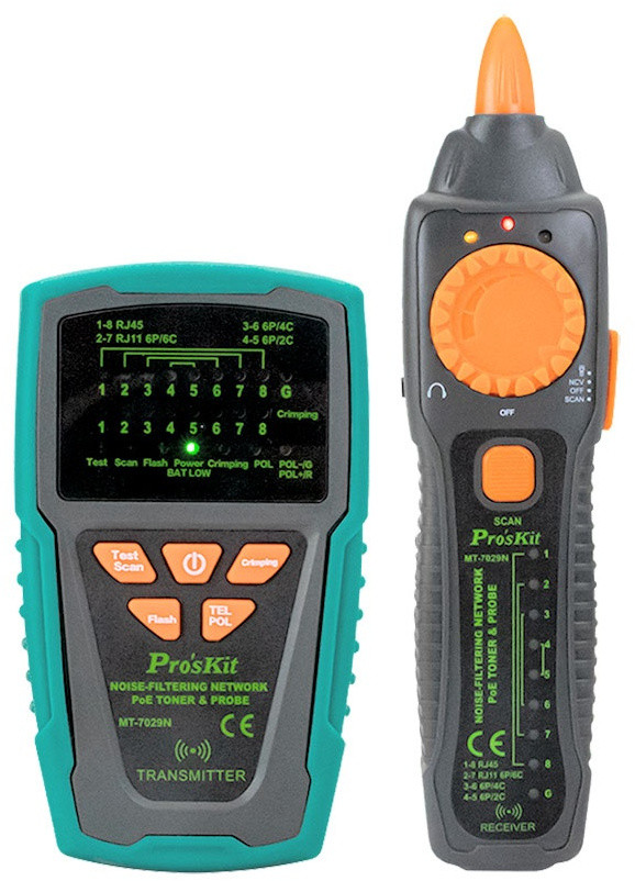 Comprobador de cables de redes y localizador de conductores por tono. Ideal para localizar y verificar fácilmente el estado de un cable, solucionar problemas de cables cruzados, en corto, abiertos y continuidad en cables de red RJ45 categoría 5, 5e, 6 y 7 (UTP/STP), en cables de teléfono RJ11, RJ12, categoría 3 (2/4/6 pin) y otros tipo de conductores rígidos / flexibles mediante las pinzas de cocodrilo. Ideal para todo tipo de instalaciones ya sean en interior o exterior, mantenimiento de telecomunicaciones, redes, comunicaciones de datos y otros tipos de cableado.
